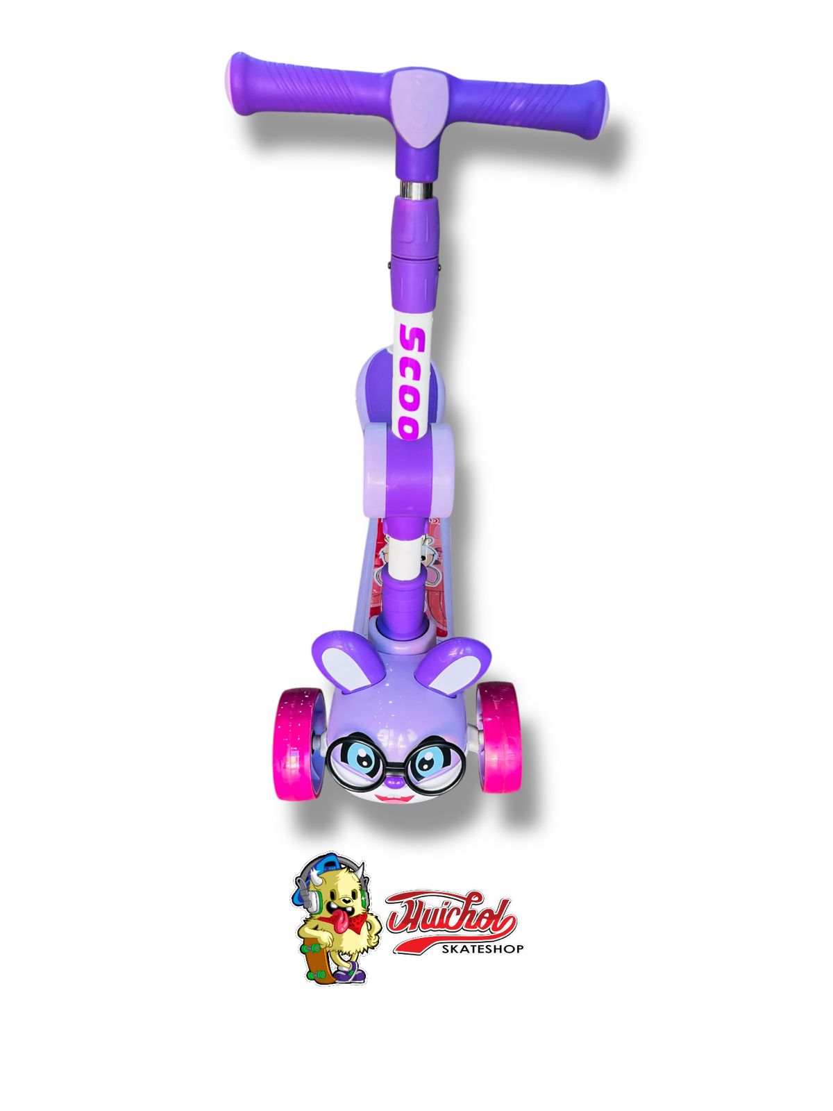 Scooter ajustable musical con luz y asiento para niño color morado. Diseño 3 ruedas con mayor estabilidad, luces LED en ruedas y estructura resistente, ideal para niños pequeños que están iniciando en el patinaje recreativo.