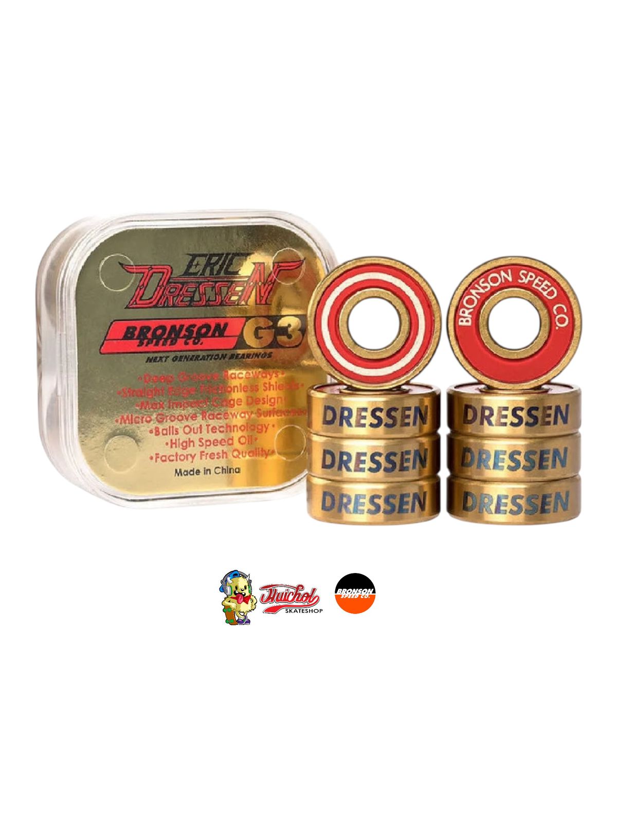 Su diseño en acabado dorado con tapas rojas y el nombre del legendario Eric Dressen los convierte en una pieza de colección, además de un componente de alto rendimiento para patines y skates. Perfectos para quienes buscan precisión profesional y un estilo inigualable.