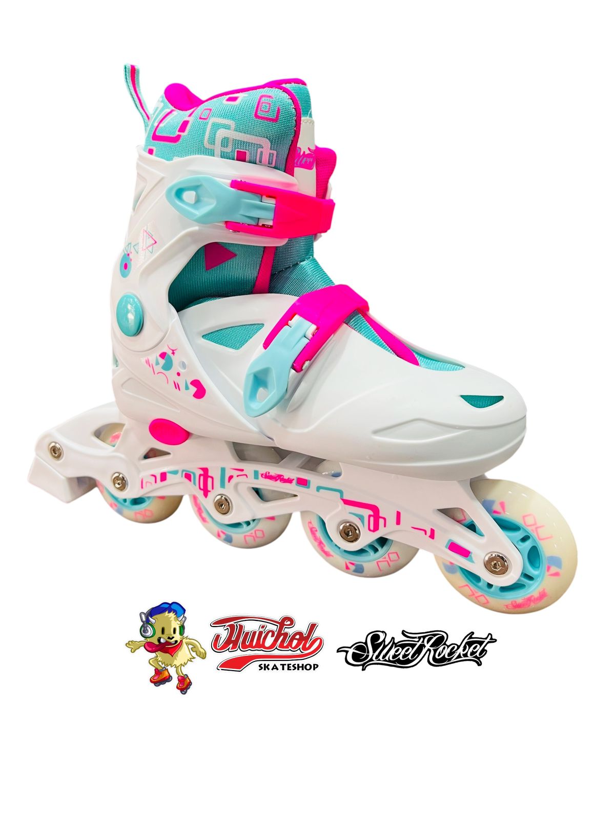 Los patines están diseñados con un look vibrante en rosa y detalles geométricos que encantan a las más pequeñas, además de ofrecer un ajuste cómodo y seguro. La estructura robusta brinda estabilidad, mientras que las ruedas suaves permiten un desplazamiento fluido.