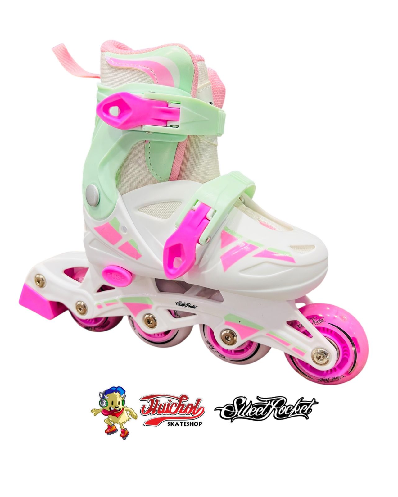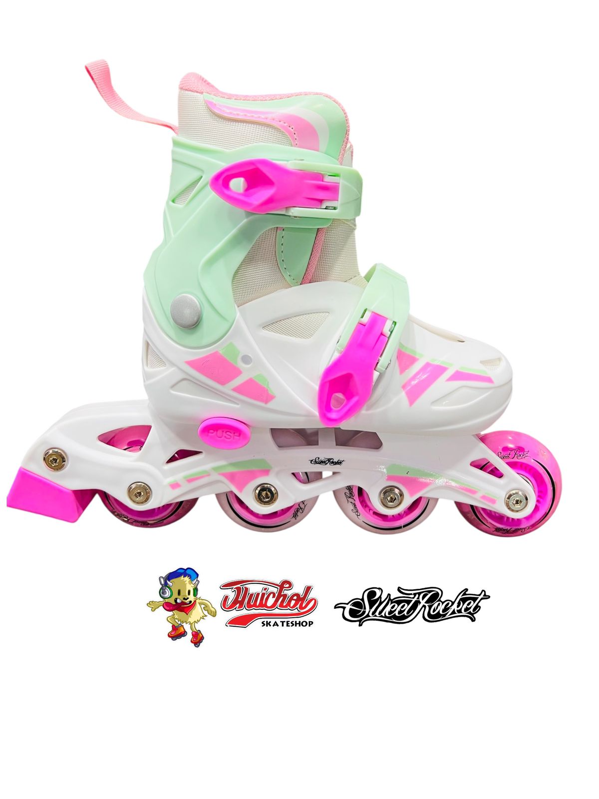 Con ruedas suaves que garantizan una experiencia estable y correas seguras que brindan un ajuste cómodo, estos patines están diseñados para ofrecer diversión sin riesgos. Además, su atractivo diseño en tonos pastel verde menta y rosa neón los convierte en un favorito instantáneo para niñas y niños que buscan destacar mientras aprenden.