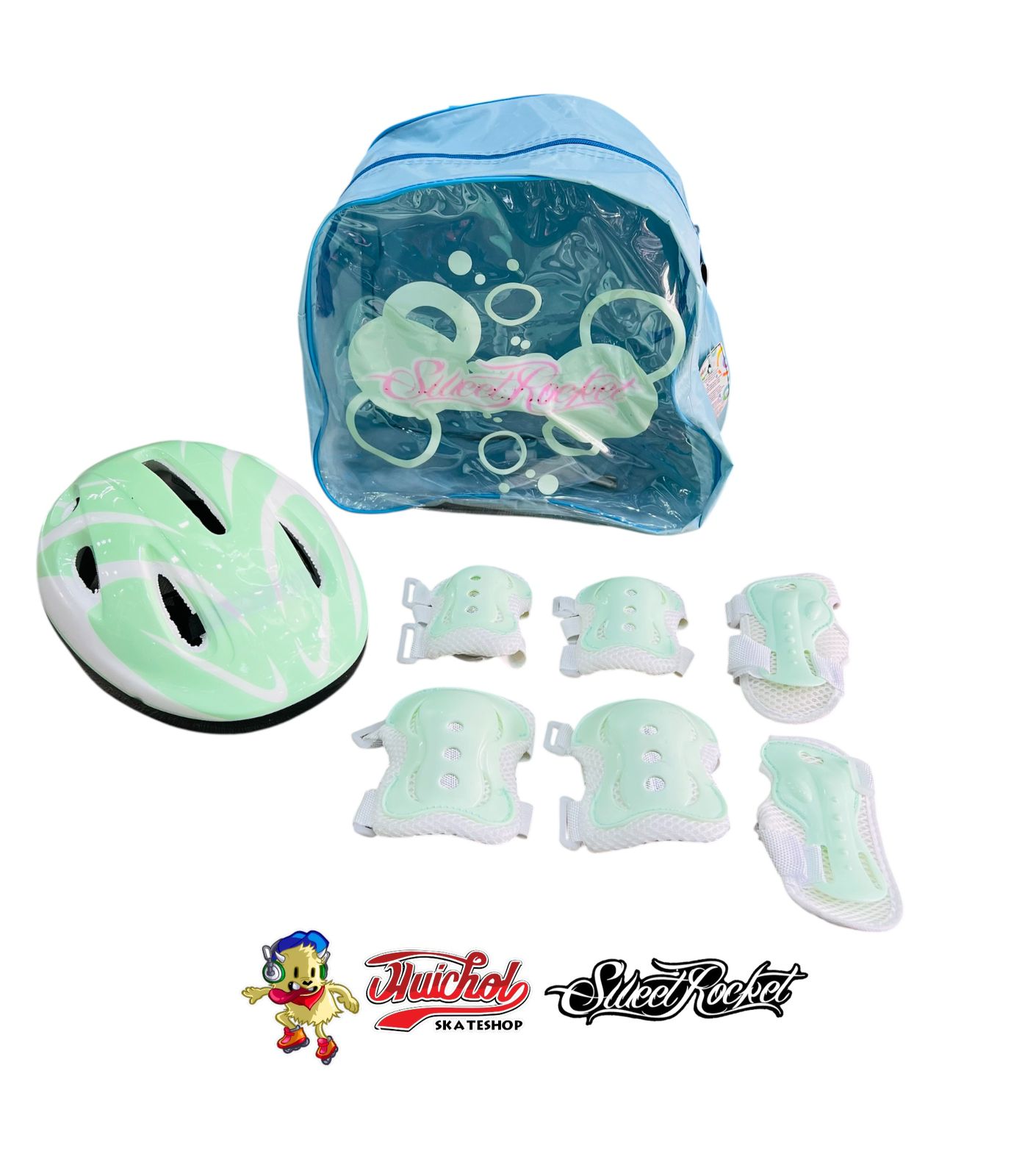 El kit de patines Sweet Rocket color verde con rosa es la opción perfecta para los pequeños que quieren iniciar su aventura sobre ruedas. Este set completo incluye un par de patines ajustables con diseño ergonómico, protecciones para rodillas, codos y muñecas, un casco de seguridad y una práctica mochila transparente para llevar todo con estilo.