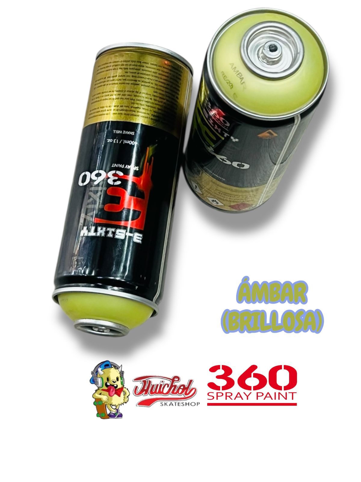 La 360 Spray Paint Color Ámbar Brillosa 400ml ofrece un tono amarillo con matiz verdoso y acabado brillante ideal para efectos luminosos y detalles de alta visibilidad.