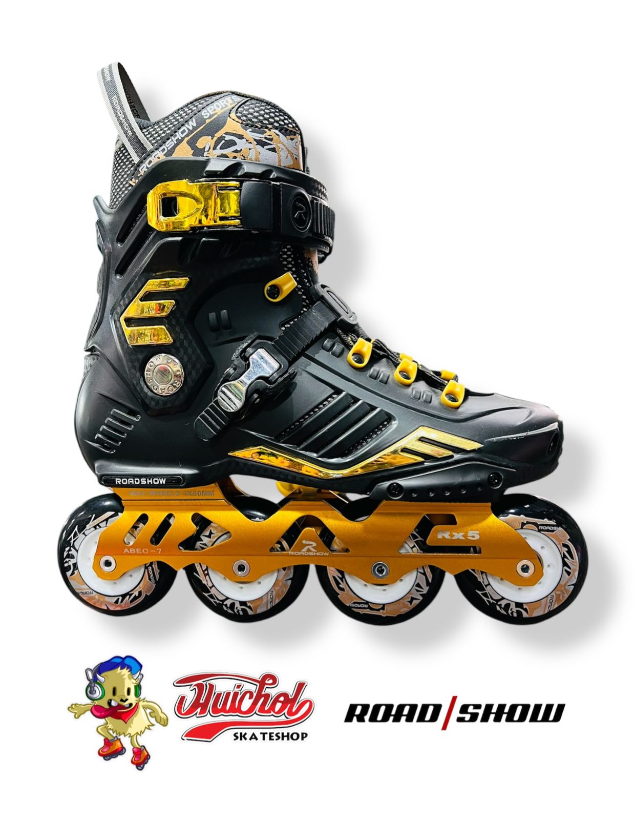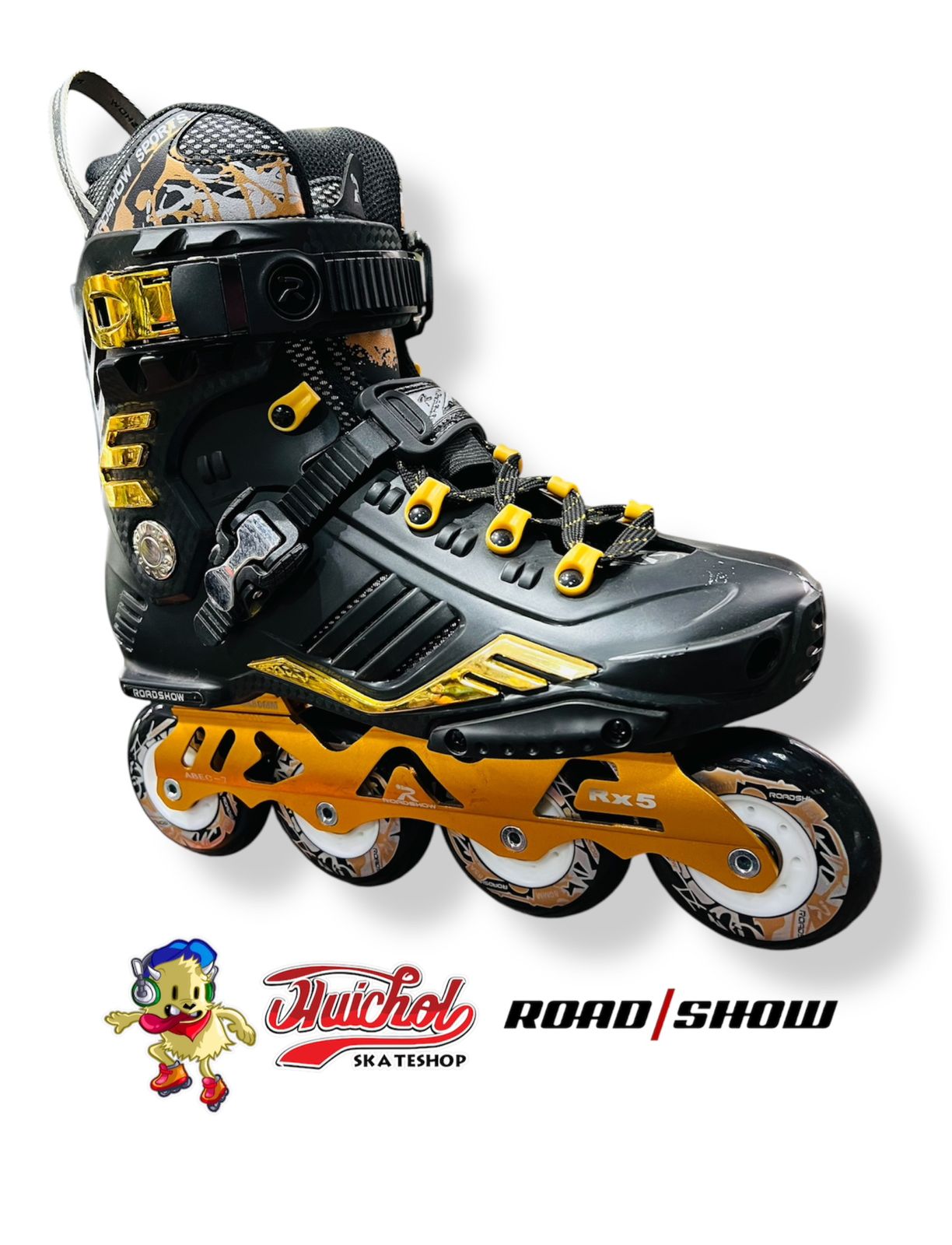 Domina las calles con los Patines Road Show RX5 en su versión negro con dorado, diseñados para quienes buscan alto rendimiento y un look imponente. Su estructura rígida brinda soporte total al tobillo, ideal para trayectos urbanos o entrenamientos técnicos.