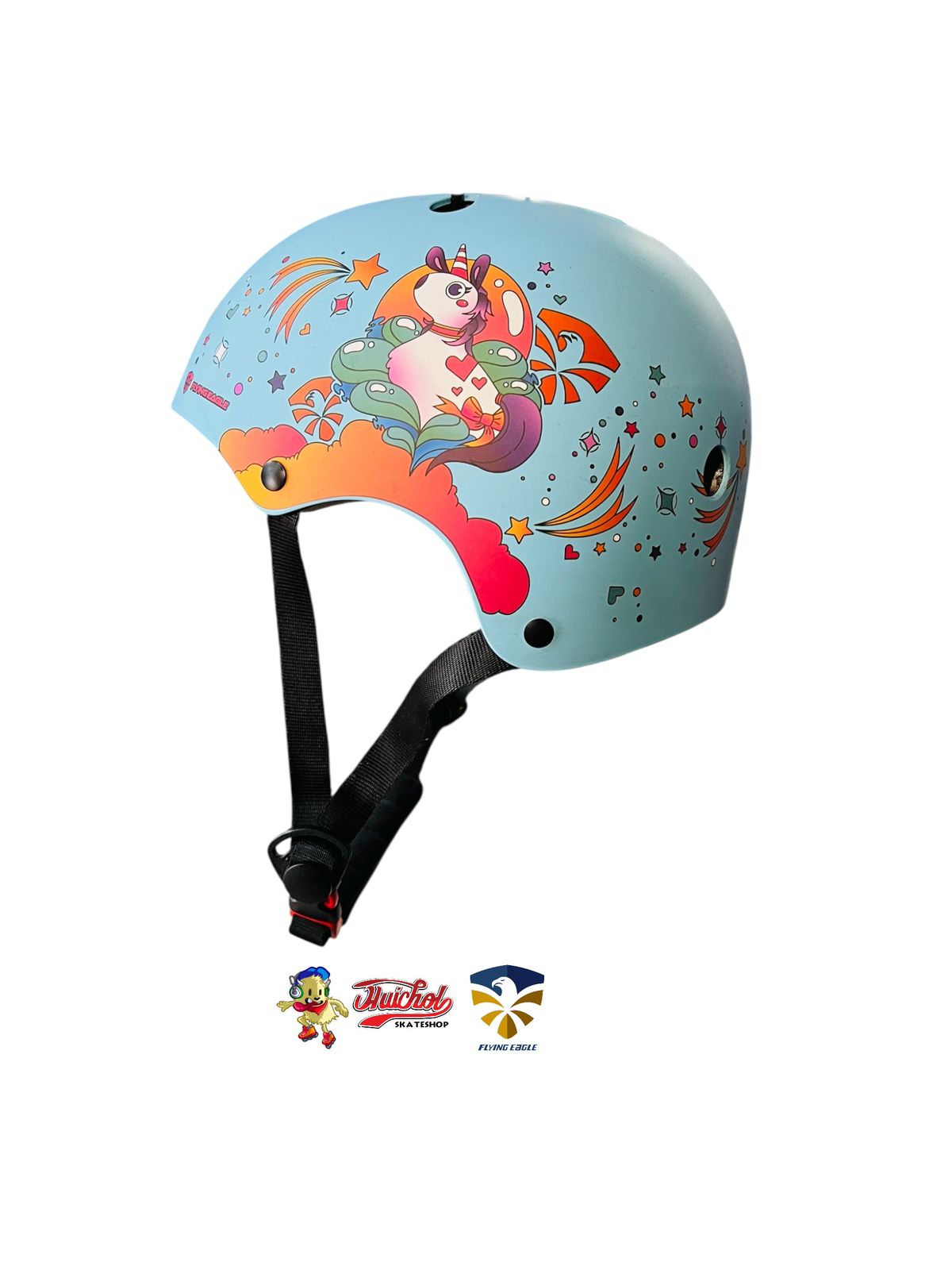 El Casco Flying Eagle Unicornio es la combinación perfecta entre diversión, seguridad y estilo. Diseñado especialmente para los más pequeños, cuenta con un acabado en color azul pastel con ilustraciones vibrantes de un unicornio rodeado de estrellas y arcoíris, que lo convierten en el favorito de niñas y niños amantes de la fantasía.
