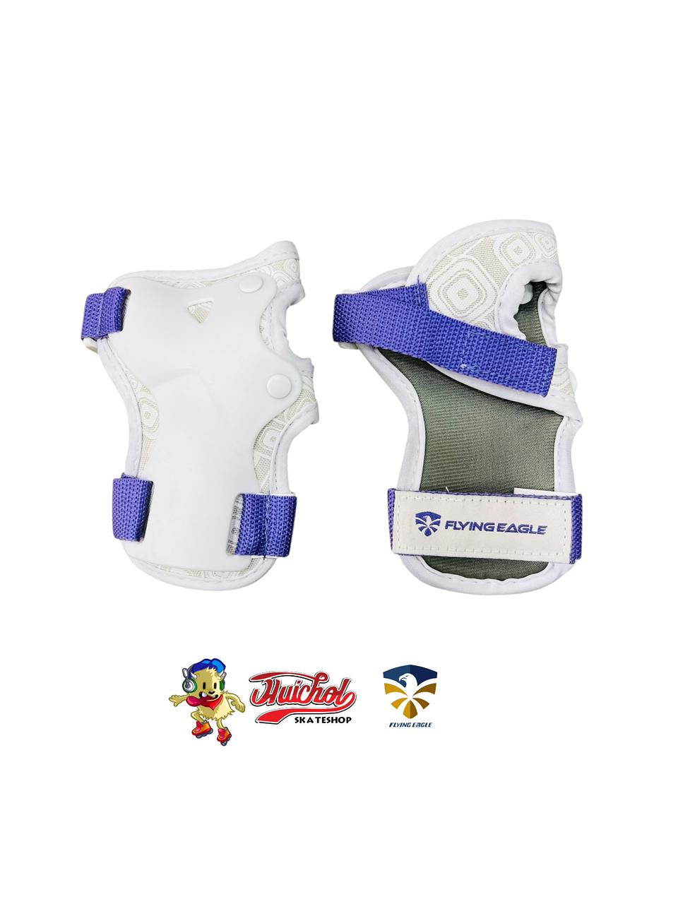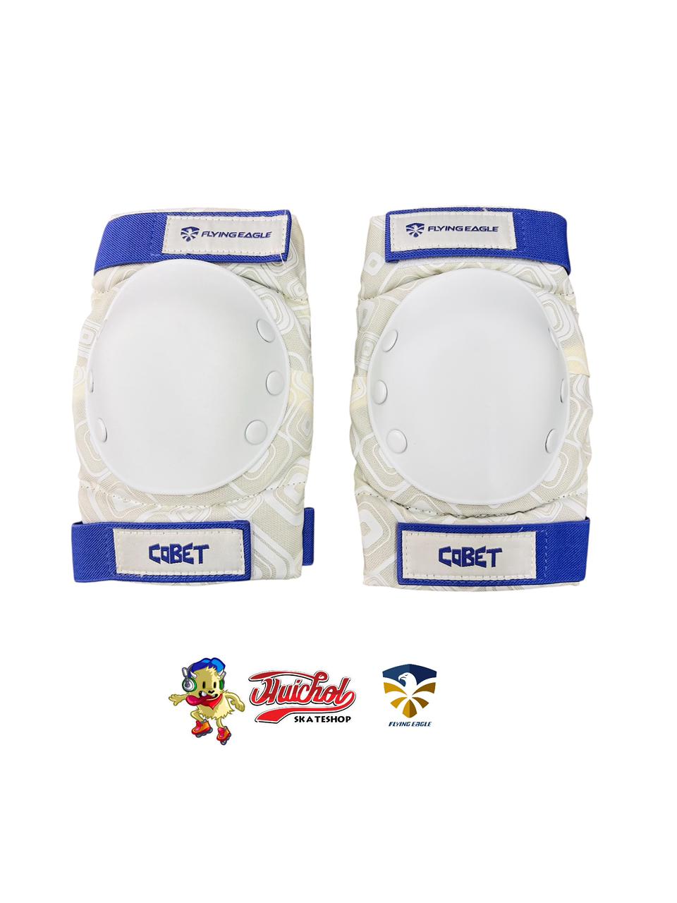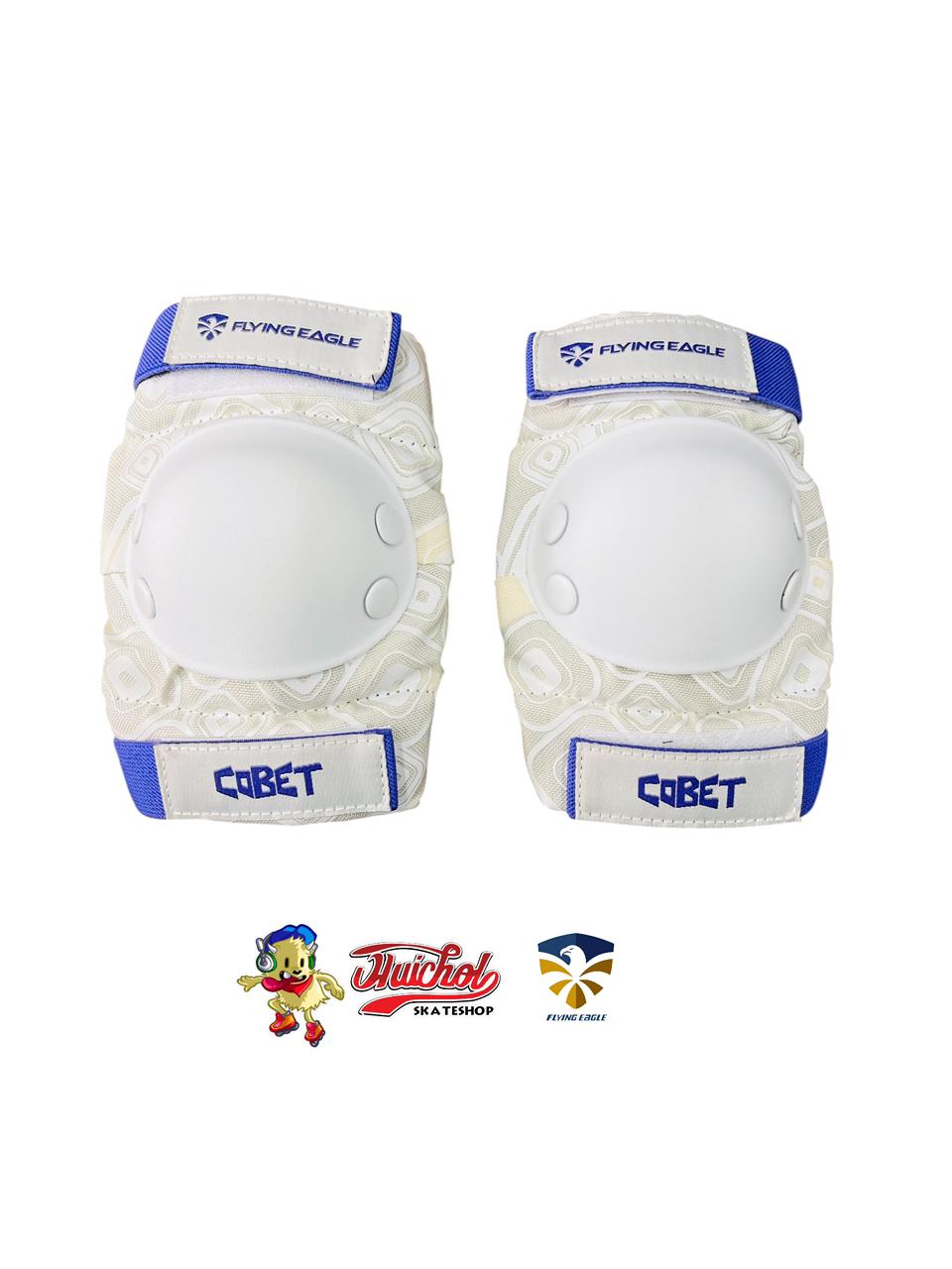 🛡️ Protecciones Flying Eagle Cobett – Set completo con coderas, rodilleras y muñequeras en diseño blanco y azul, ideal para patinaje, skate y deportes extremos.