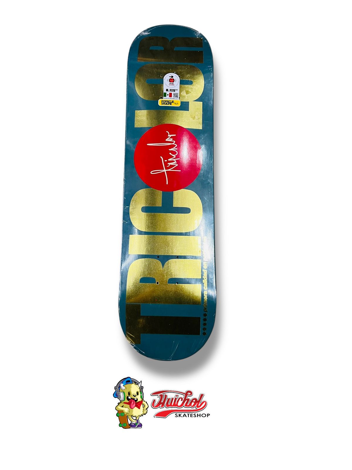 Tabla Tricolor Letras 8.1″ – Diseño minimalista y audaz con detalles dorados, ideal para skaters con actitud y estilo. ✨