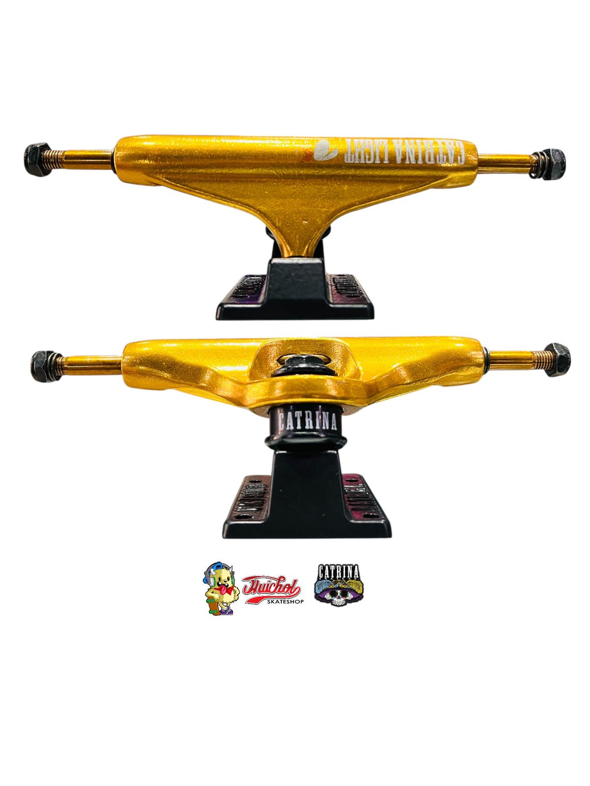Truck Catrina Classic Gold 139 mm – Unos ejes resistentes y ligeros en acabado dorado metálico con baseplate negro, ideales para quienes buscan estilo, rendimiento y durabilidad en su patineta.