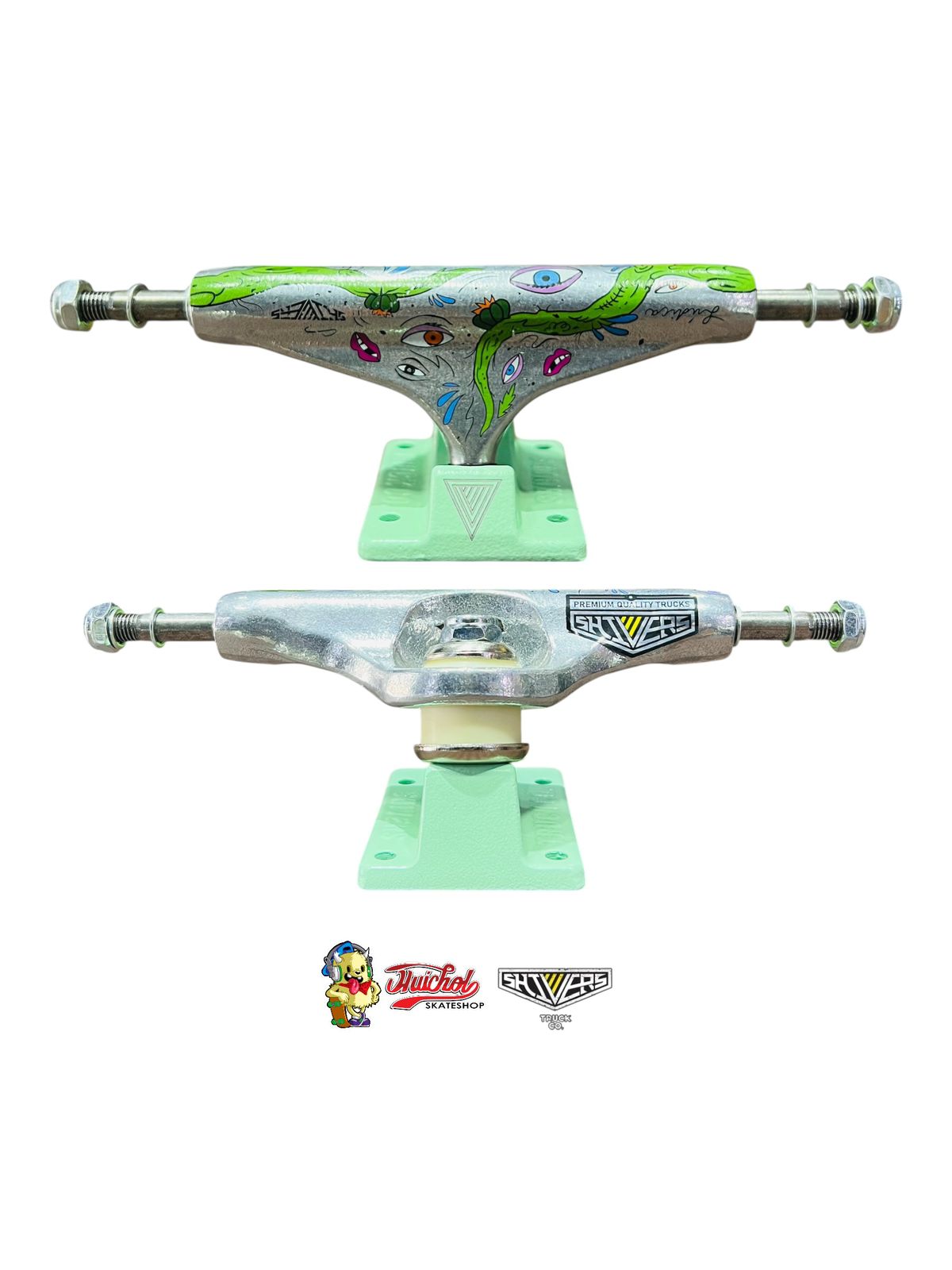 Fabricados en aluminio de alta durabilidad, estos trucks garantizan un giro estable y preciso, ideales para street, park y rampas. Su base verde pastel y el grabado artístico sobre el hanger los convierten en una pieza única para riders que buscan destacar tanto en desempeño como en estilo. Compatibles con tablas de 7.8” a 8.2”, son una elección perfecta para quienes quieren combinar funcionalidad con diseño creativo.